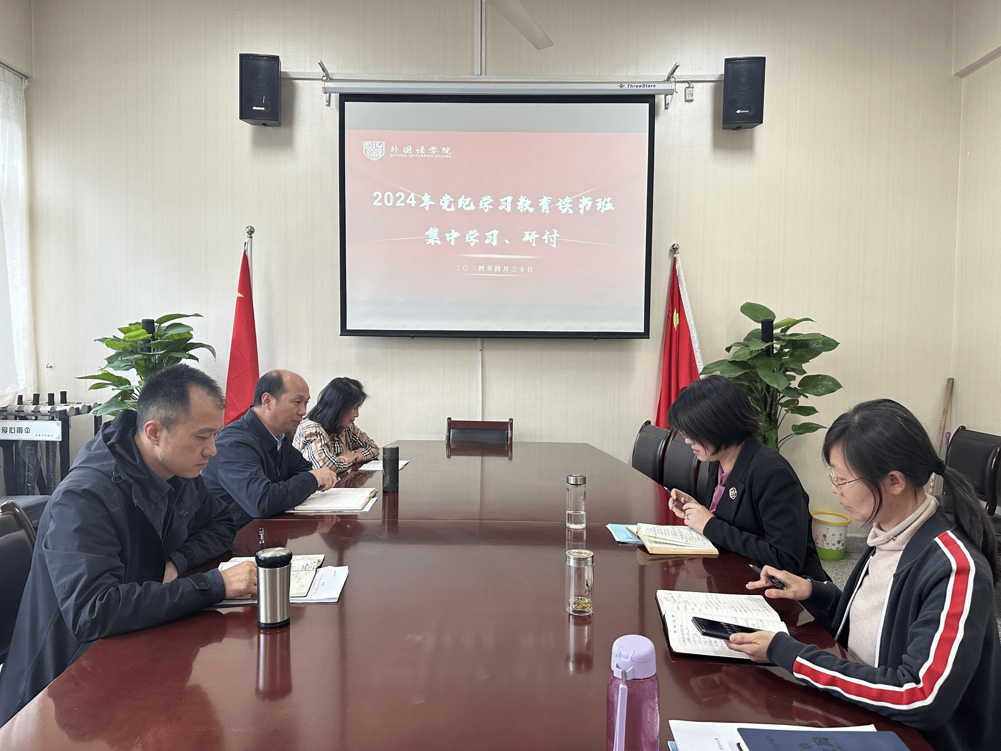 4月29日,外国语学院党总支举办党纪学习教育读书班,党总支书记王一传达中共今年会官方网站委员会印发《关于在全校开展党纪学习教育的实施方案》的通知精神及安排部署,解读《外国语学院关于开展党纪学习教育的实施方案》,要求全体党员要准确把握这次党纪学习教育的目标要求,全院开展“纪律五项”学习教育活动,压实党组织的领导责任,加强宣传引导,力戒形式主义,以良好作风保证党纪学习教育走深走实。本次读书班采取集中学习、个人自学、...