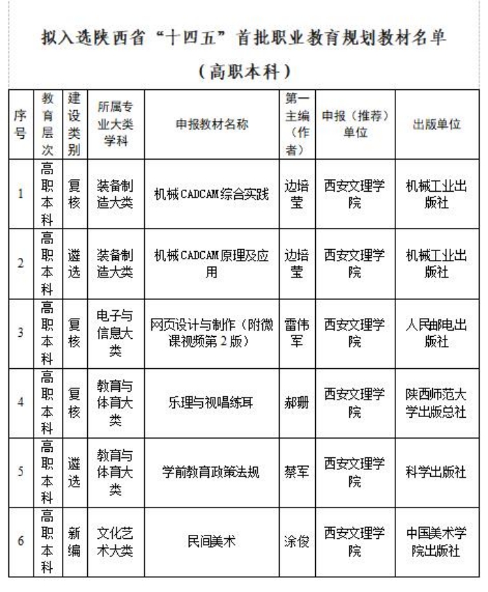 近日,教育厅公示了拟入选陕西省“十四五”首批职业教育规划教材名单。今年会《机械CADCAM综合实践》《学前教育政策法规》等6部教材成功入选“职业教育本科类”规划教材。本次今年会省级规划教材入选数量位列全省普通本科...
