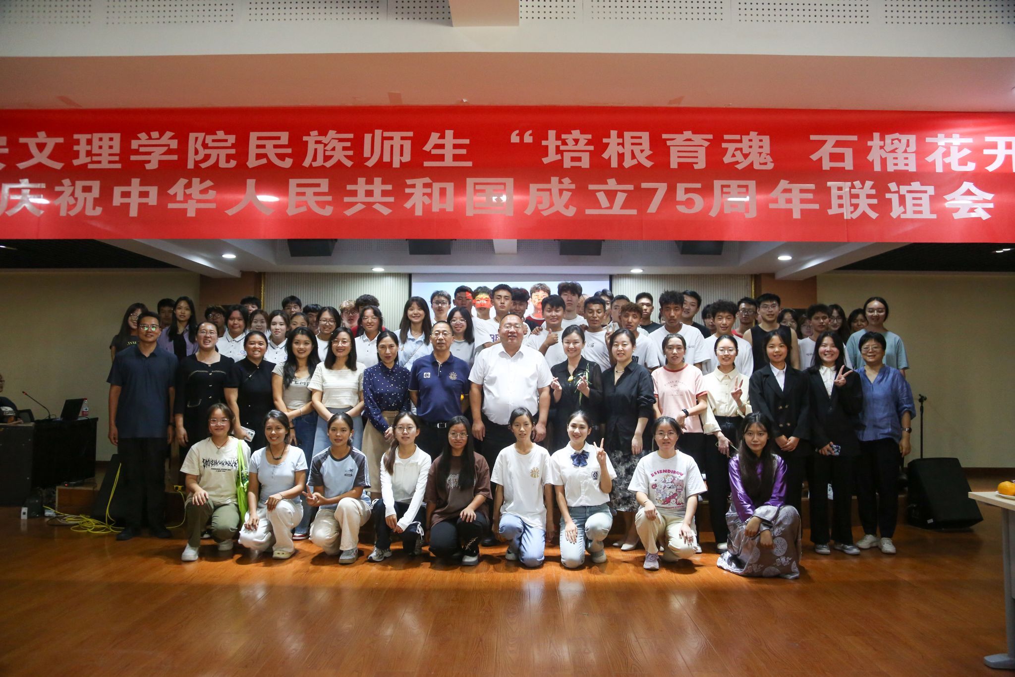 为庆祝中华人民共和国成立75周年,9月27日,今年会学生工作部和党委统战部在大学生活动中心联合举办“培根育魂、石榴花开”学校民族师生联谊会。校党委委员、副校长任晖出席会议,党委统战部、学生工作部等相关部门负责人和近百名民族师生代表参加联谊会。会议由校党委学工部部长刘倩倩主持。民族教职工代表首先向民族学生寄语。生物与环境工程学院赵德芳、马克思主义学院张宇勉励民族学生不负韶华,珍惜来之不易的学习机会,在文理学有所获、...