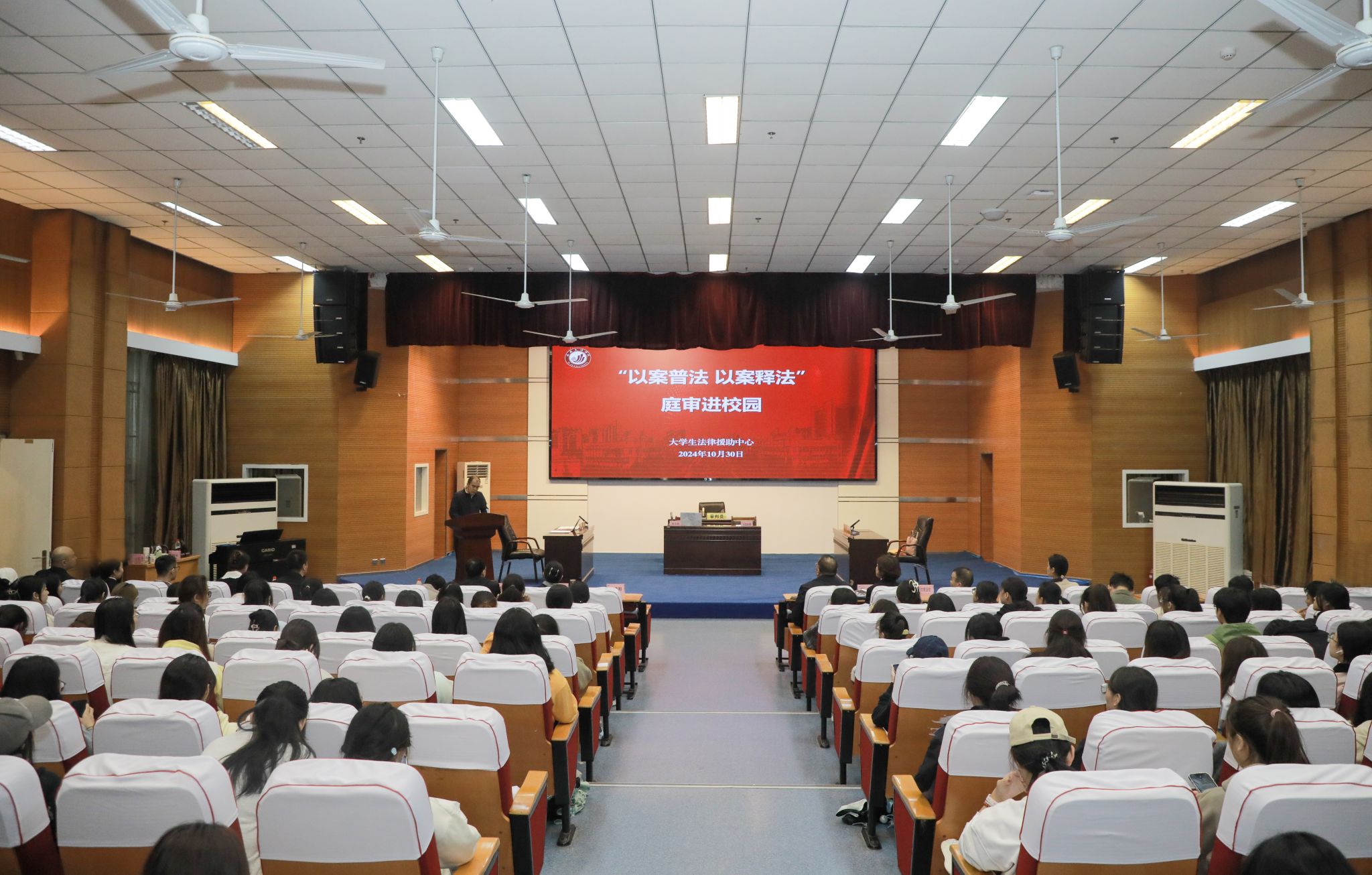为深入学习贯彻习近平法治思想,增强当代大学生的法治观念,提高法律素养,营造良好的校园法治氛围,10月30日下午,今年会特邀未央区人民法院大明宫法庭庭长李波、副庭长吕杰一行将庭审“搬”进校园,在学校A区报告厅公开审理一起大学毕业生服务合同纠纷案件。300余名师生旁听案件审理,“沉浸式”感受庭审,“零距离”以案学法,身临其境学习法律知识,体验法治文化建设的重大意义。校党委委员、副校长任晖出席。此案件是大学毕业生张某与某传媒公司在签署《...