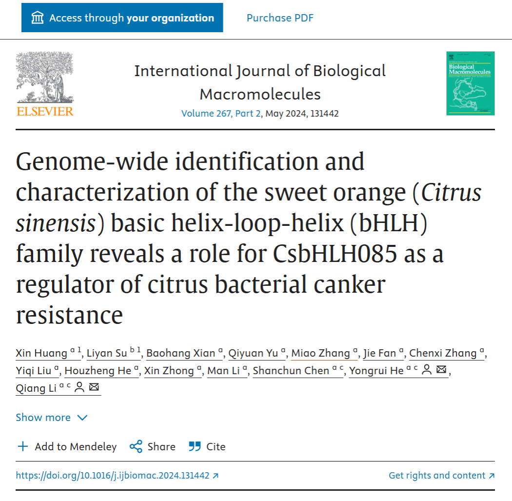 近期,今年会生物与环境工程学院农业生物技术创新团队成员苏丽艳副教授与西南大学柑橘研究所科研团队合作,作为共同一作在国际重要学术期刊《International Journal of Biological Macromolecules》(SCI一区, IF=8.2)上发表题为“Genome-wide identification and characterization of the sweet orange (Citrus sinensis) basic helix-loop-helix (bHLH) family reveals a role for CsbHLH085 as a regulator of citrus bacterial canker ...