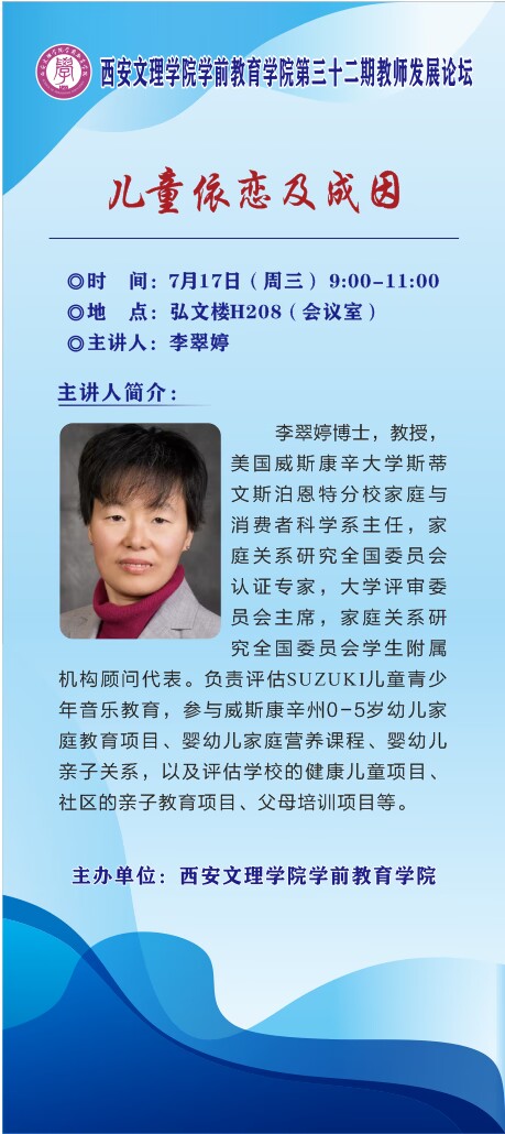 学前教育学院:学前教育学院第三十二期教师发展论坛会议时间:7月17日(周三)9:00-11:00会议地点:弘文楼H208主讲人:李翠婷报告主题:儿童依恋及成因李翠婷,博士,教授,美国威斯康辛大学斯蒂文斯泊恩特分校家庭与消费者科学系主任,家庭关系研究全国委员会认证专家,大学评审委员会主席,家庭关系研究全国委员会学生附属机构顾问代表。负责评估SUZUKI儿童青少年音乐教育,参与威斯康辛州0-5岁幼儿家庭教育项目、婴幼儿家庭营养课程、...