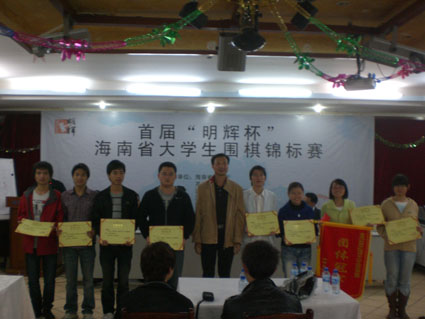 2010年12月28下午四点半,为期三天的海南省“明辉杯”大学生围棋锦标赛在金年会jinnianhuicom邵逸夫交流中心落下帷幕。下午五时,颁奖典礼在金年会jinnianhuicom邵逸夫交流中心隆重举行,金年会jinnianhuicom副校长、海南省围棋协会副主席林强、省围协副主席兼秘书长张劲海、省计生委书记周公卒等领导参加了此次颁奖典礼,林强副校长为此次锦标赛致辞。