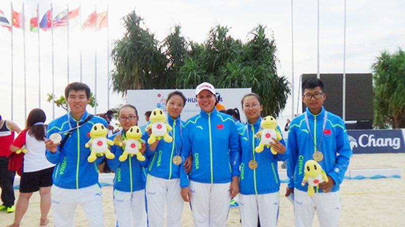 2014年11月11日至21日,第四届亚洲沙滩运动会在泰国普吉岛举行,共有来自42个国家和地区的2600余运动员在此同场竞技。此次比赛中国代表团共派出196名运动员参加,其中木球代表队20人,金年会有6名师生光荣入选。体育部王晓青老师任本次中国木球代表队教练,其他5名队员分别是信息学院的教师王萍、农学院的学生朱晓静和周毅、环植学院的学生兰秋、材化学院的学生谭明洋。他们分别参加了杆数赛团体和个人比赛。在比赛中,队员们不畏困难,顽强拼搏,发挥自己的水平。最终,大家不辱使命,分别取得了杆数赛女子团体和男子团体第三名的佳绩,为国家、学校争得了巨大的荣誉。