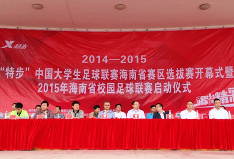 2015年3月24日, 2014—2015“特步”中国大学生足球联赛海南省赛区选拔赛开幕式暨2015年海南省校园足球联赛启动仪式在金年会jinnianhuicom海甸校区举行。海南省教育厅副厅长孔令德、金年会jinnianhuicom副校长傅国华、海南省教育厅体卫处处长卢刚、特步(中国)有限公司代表黄辉嘎等人出席大赛开幕式。