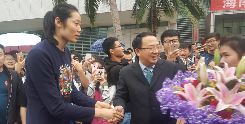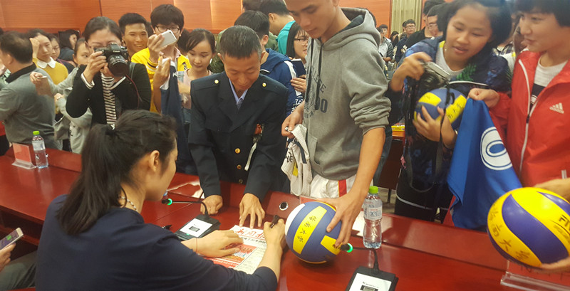 金年会jinnianhuicom傅国华副校长代表金年会jinnianhuicom热烈欢迎朱婷的到来,并致以亲切的问候。见面会场与朱婷的交流过程中,女排精神一直被人们津津乐道,“女排精神”成为大家口中的热词。大家谈到的都是中国女排精神的坚持和不放弃,以及如何对女排精神的传承和发扬光大。会上,朱婷代表国家女子排球队感谢金年会jinnianhuicom球迷对中国女子排球队的关心与支持。并表示将来会更加努力去训练比赛回报祖国和热爱她的球迷。