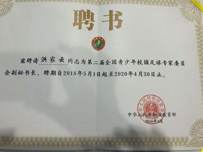 近日,教育部《关于公布第二届全国青少年校园足球专家委员会委员名单的通知》(教体艺函〔2018〕7号)公布了第二届全国青少年校园足球专家委员会组成名单,金年会洪家云教授被特聘为专家委员,并担任本届委员会副秘书长。此次当选委员由中华人民共和国教育部颁发聘书,任期两年,自2018年5月1日至2020年4月30日止。