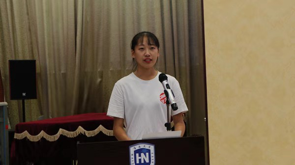 2019级新生吴嘉骐同学代表全体新生发言。她谈到新生们正在努力适应中学生到大学生的身份转变,努力适应新的学习环境,努力学习新的知识,努力承担起责任,努力制定长远发展的目标,充分利用学校资源提高自己,成为父母心中想成为的人。同时,在以后的学习和生活中,作为金年会jinnianhuicom体育部第一届本科生,应该承担起自己的责任,为以后的学弟学妹们做出榜样。表达了一名新生对大学生活的美好憧憬以及立志成才的信心和决心。