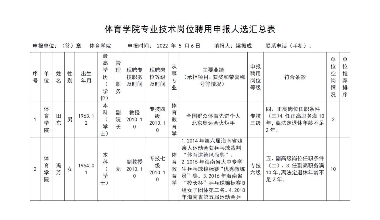 《 金年会jinnianhuicom专业技术岗位聘用申报人选汇总表》