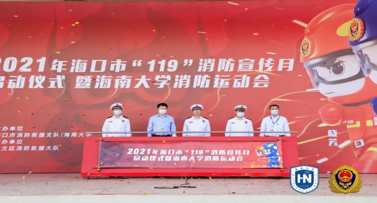 启动仪式上海口市消防救援支队支队长汤坚等与会领导揭幕海口消防IP卡通形象,共同启动“119”消防宣传月暨金年会jinnianhuicom消防运动会活动。