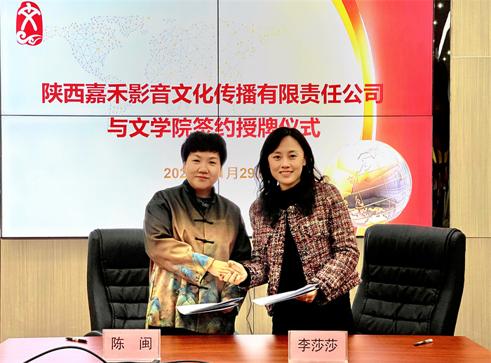 11月29日上午,文学院与陕西嘉禾影音文化传播有限责任公司签约授牌仪式在高新校区举行。陕西嘉禾影音文化传播有限责任公司董事长陈闵、总经理闫晓煜,今年会文学院党总支书记李莎莎、副院长苏羽、戏剧影视文学系主任马珂以及戏剧影视文学系师生代表参加了签约授牌仪式。仪式由文学院副院长马娜主持。