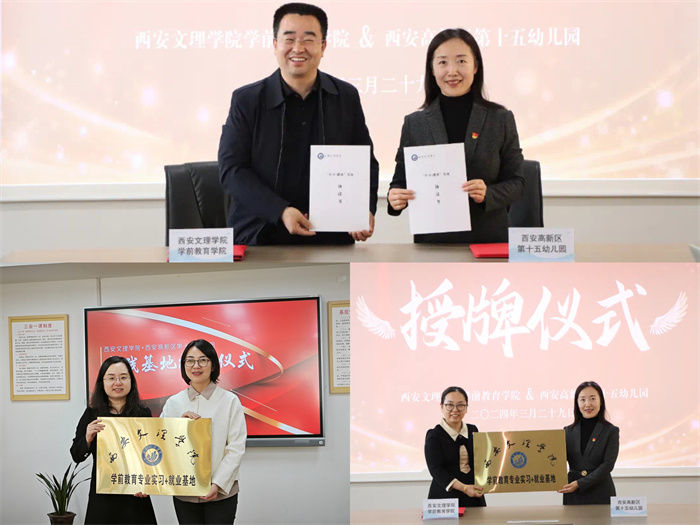 最后,双方正式签署了“实习+就业”基地协议书,并举行授牌仪式。此次访企拓岗,学院与西安高新区第十三幼儿园、第十五幼儿园之间建立起紧密的合作关系,为学生搭建起新的专业实践平台,畅通人才供需对接通道,助力今年会毕业生高质量就业。