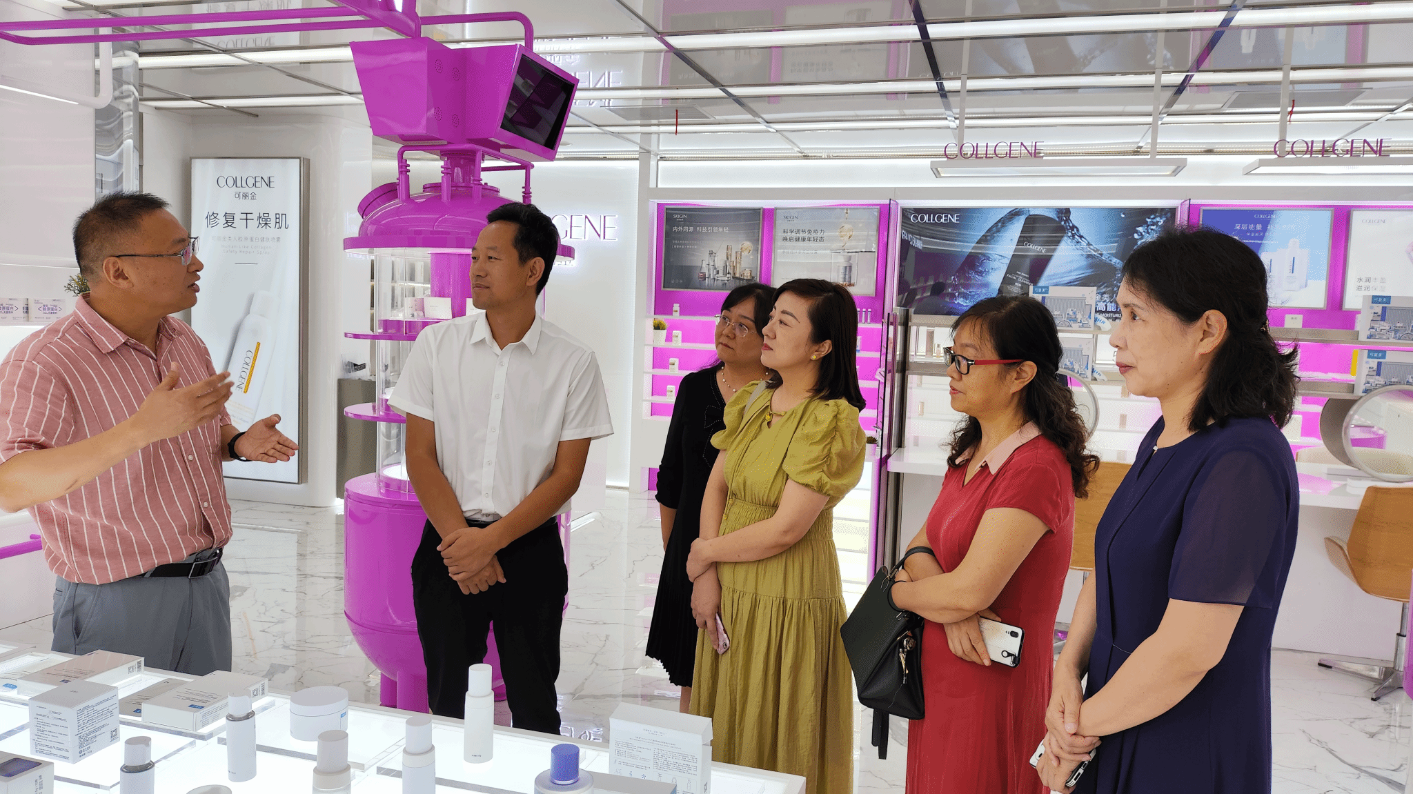 座谈会前,张宇热情接待了学院一行,并带领大家参观了巨子生物企业历史墙、荣誉展厅、产品展厅及生产车间,详细介绍了巨子生物科技研发进展、科创成果转化、未来战略布局等相关情况。