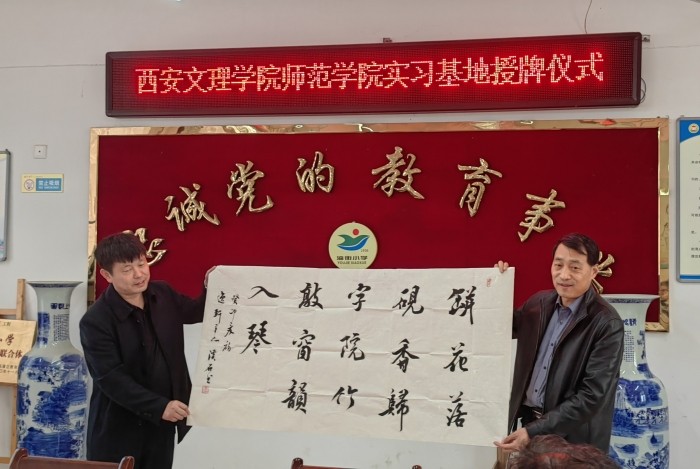 马伟向三所小学授牌、签订实习基地协议,并向三所小学赠送书法作品。