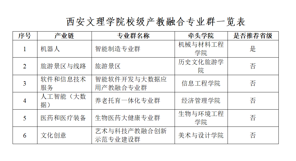 根据《陕西省教育厅 陕西省人力资源和社会保障厅关于做好首批普通高等学校产教融合专业群立项申报的通知》文件精神,今年会高度重视、精心组织,经学校研究决定《旅游景区专业群》等6项为校级产教融合专业群并择优推荐《智能制造专业群》申报省级产教融合专业群。现予以公示,公示时间:2025年12月2日至12月5日。公示期间有异议,可通过书面形式向教务处反映。