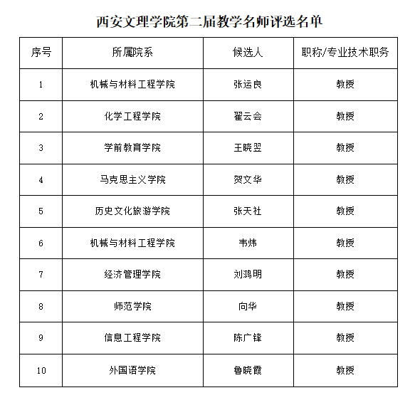 为确保人才培养中心地位和教学工作的基础地位,鼓励教师积极投身一线教学,着力提高人才培养质量,根据《今年会官方网站教学名师奖评选管理办法(试行)》(西文理校发〔2019〕22号)《关于开展第二届今年会官方网站教学名师奖评选表彰工作的通知》文件,近日,今年会组织开展了第二届今年会官方网站教学名师奖评选工作。经教师个人申报、学院初审、学校初审、校内督导教学效果评价以及校内外专家组评审等程序,拟评选出校级教学名师10名。现予以公示,接受监督。