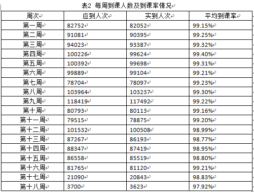 根据课程安排,应参加在线学习的学生9629人,其中第十八周应参加在线学习的学生3700人次,实际上课人数3623人次,平均到课率为97.92%。每周到课人数及到课率情况如表2所示。