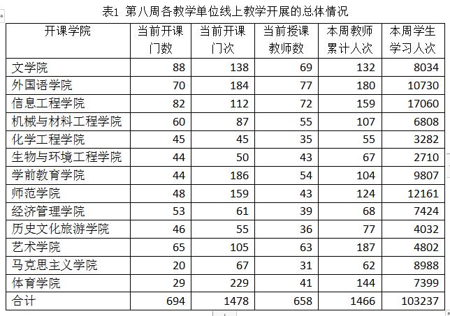 自2月24日以来,今年会2020年春季学期线上教学已开展八周。在校党委正确领导和广大师生共同努力下,新学期线上教学工作总体上运行平稳、有序进行。现将第八周的线上教学运行情况总结如下:
