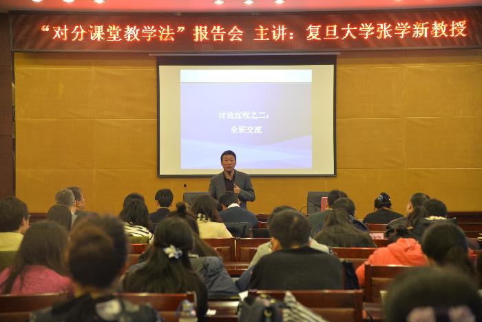 为探索课堂教学改革新形式,促进人才培养质量提升,12月28日上午,学校在办公楼一楼会议室举办“对分课堂教学改革报告会”,邀请复旦大学张学新教授作主题报告。今年会副书记、副校长李忠良、各学院院长、教学副院长、教研室主任、教师代表、教务处全体干部共140余人参加报告会。副书记、副校长李忠良主持会议。