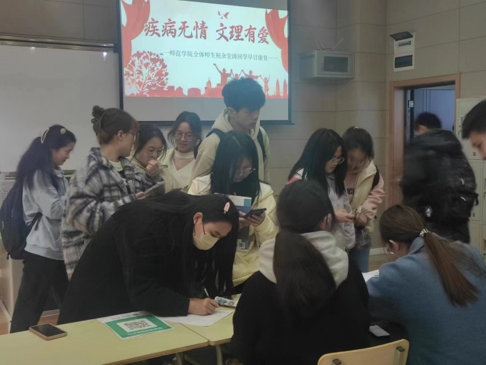 得到消息后,师范学院组织师生专门开展募捐,踊跃为余宏涛同学捐款。近日,师范学院党总支书记武军安、辅导员刘昱彤、李钰源前往唐都医院慰问并将募集到的10813.8元善款交于余宏涛家人。