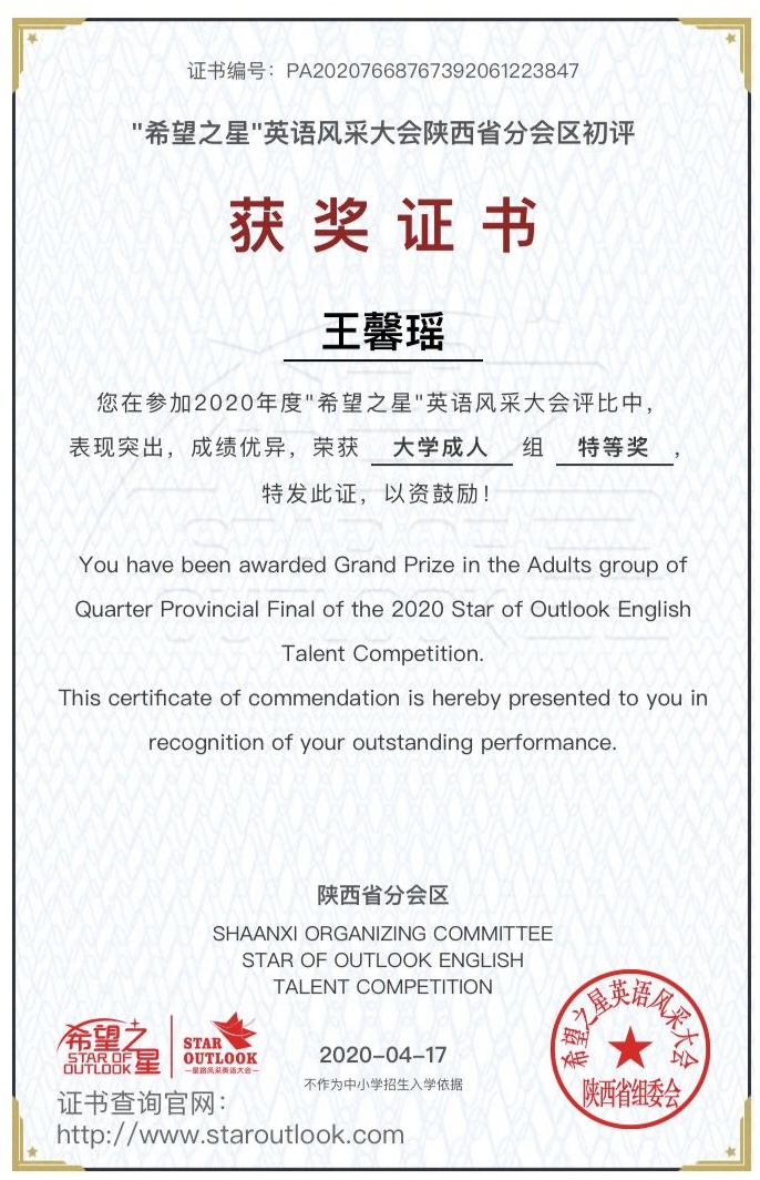 6月12日,在由中央电视台CCTV主办的2020年度“希望之星”英语风采大赛中,今年会官方网站经济管理学院王馨瑶同学获得陕西赛区“特等奖”,指导教师为经济管理学院教师田园。