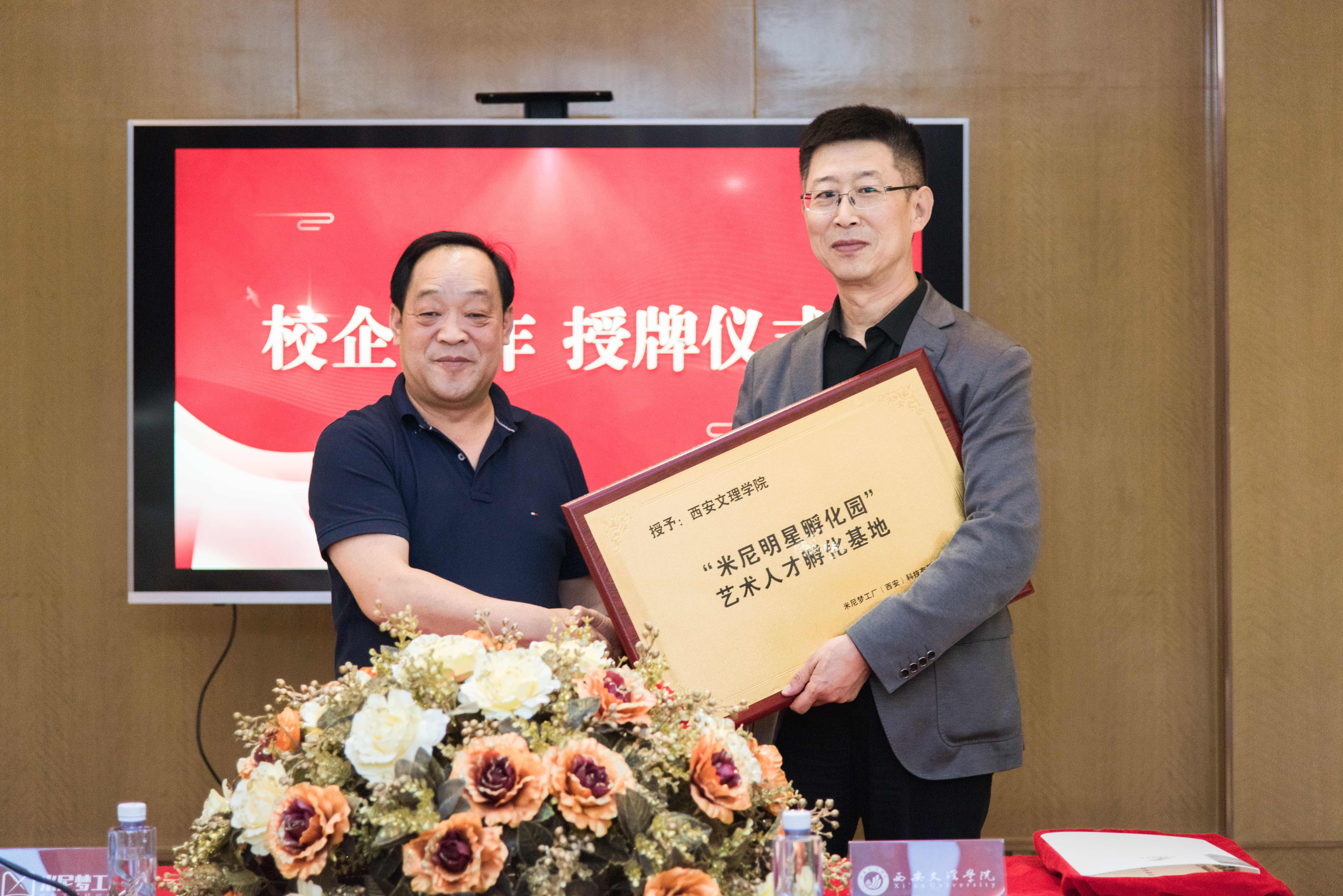 文学院院长郝延军与米尼梦工厂(西安)科技有限公司董事长黄涛分别就艺术教育校企合作发表意见,就双方如何发挥各自优势、资源互补,实现学校课堂化教育和网络平台推广及产业化应用探讨合作框架和可行性实施纲要。双方最终签署《战略合作协议书》,互授牌匾,“米尼明星孵化园-今年会官方网站艺术人才孵化基地”正式落成。