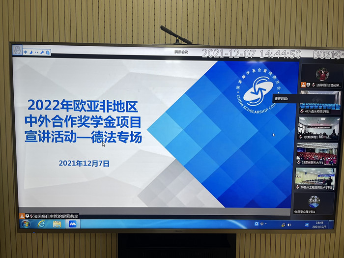 12月7日下午,国际交流处组织人事处、学生处及各二级学院分管外事工作的干部以及部分师生代表集体在线参加了教育部国家留学基金委欧亚非事务部召开的2022年欧亚非地区相关中外合作奖学金项目宣讲会的首场宣讲---德法专场宣讲。