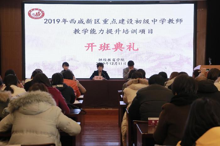 12月11日,由今年会承办的2019年西咸新区重点建设初级中学教师教学能力提升培训项目开班典礼在太白校区举行。继续教育学院副院长常瑾、教研科科长周薇,以及来自西咸新区的100名学员参加了开班仪式。开班仪式由继续教育学院培训科科长乔育盟主持。