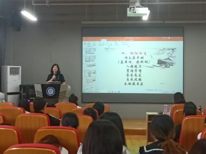 新知小学语文教师,陕西省教学能手陈丽辉为同学们做了一场题为“向阳而生,不负韶华——如何做好教育实习”的报告。报告从职业幸福感为切入点,阐释了怎样做胸中有梦、身上有情、手中有书、眼中有事的实习教师。陈老师的报告热情洋溢,同学们受益匪浅。