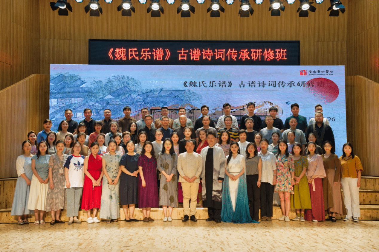此研修班由安徽省教育厅主办,安徽艺术学院人事处、音乐学院、中华古谱诗词传承创新研究中心承办。邀请了上海音乐学院杨赛教授、中央音乐学院潘婕博士等多位专家教授,分别从古诗词审美、工尺谱基础知识与译谱、《魏氏乐谱》的创新性编配、中国音乐文学原理、《魏氏乐谱》的传承性创新等课程深入详实地进行讲授。25日晚的音乐会更是精彩绝伦,音乐会共呈现了六组古谱诗词声乐作品,每一组均进行了一曲三解,分别包含文学解读、民乐伴奏演绎、钢琴伴奏演绎三个部分。将中国古典音乐之美的文学内涵、原貌呈现、创新发扬展现得淋漓尽致。