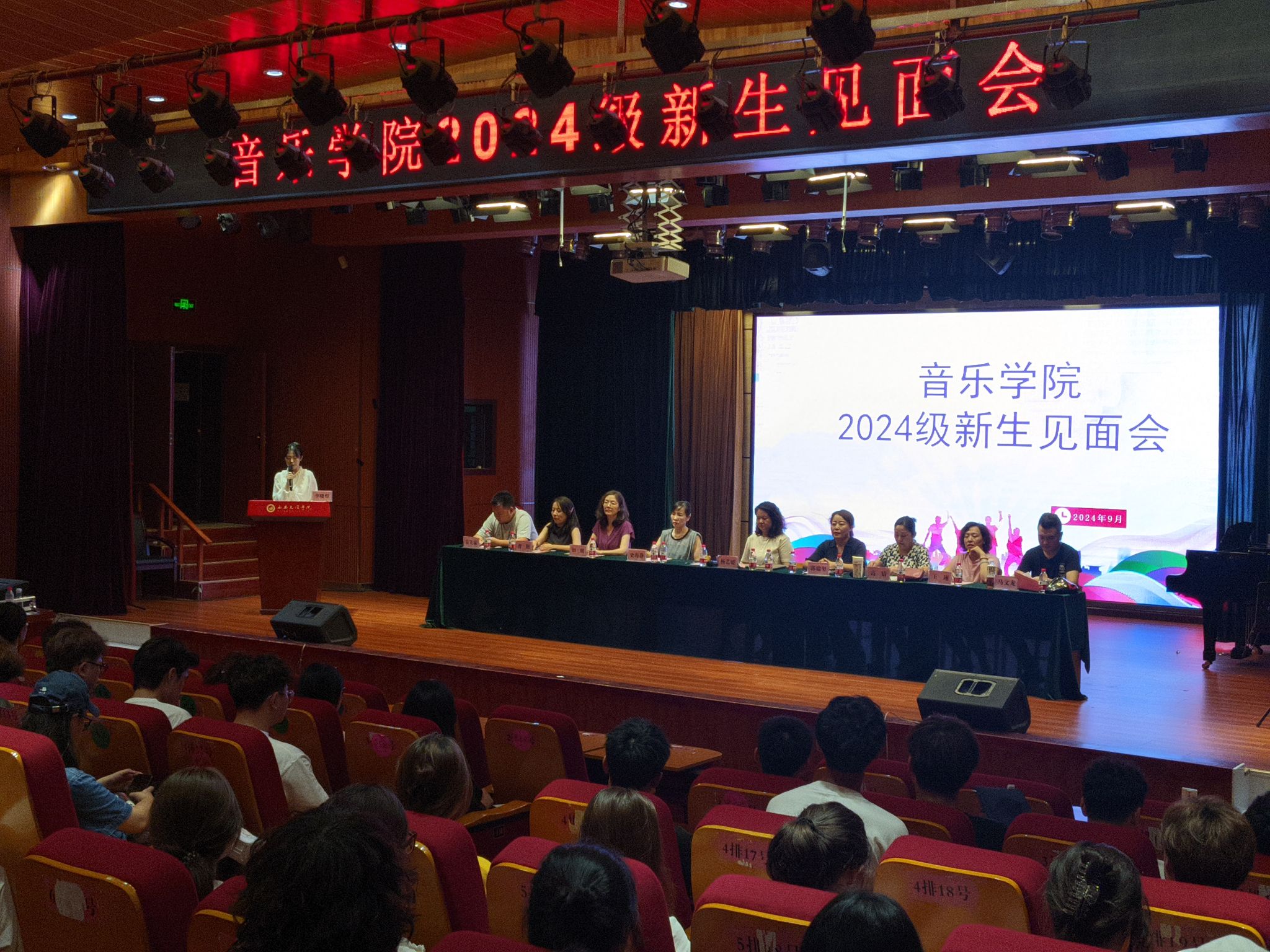 9月4日下午,音乐学院在明德楼D区演播厅举行2024级新生见面会。学院院长杨艺媛,副院长史海静、郭瑞玺,院党总支委员高婧、各系部主任、全体辅导员以及全体24级新生参加会议,会议由学院党总支委员高婧主持。