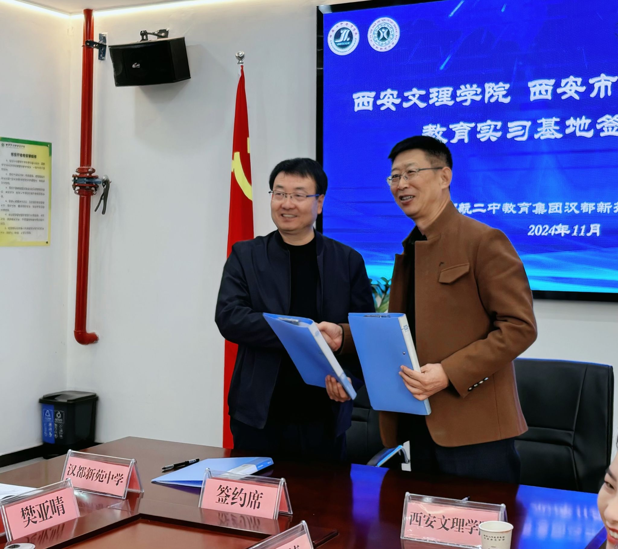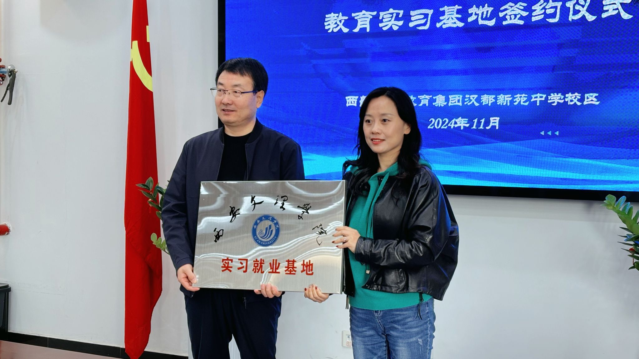 11月7日上午,文学院院长郝延军、党总支书记李莎莎、教学副院长苏羽、中文系主任李冰清与教师彭冠华一行,赴汉都新苑中学参加实习基地签约与授牌仪式。汉都新苑中学执行校长兼书记孙峰、副校长张建军、年级主任李聪,教师杨婷以及汉语言文学专业实习生共同参与此次签约授牌仪式。会议由张建军主持。
