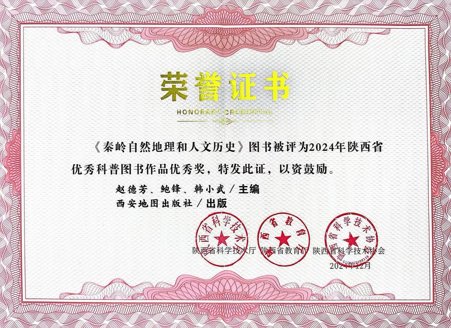 近日,陕西省2024年优秀科普作品征集活动落下帷幕,本次科普作品征集活动由省科协、省教育厅、省科技厅共同主办,以“弘扬科学精神 繁荣科普创作”为主题,征集主要类型为科普图书、科普文学作品、科普设计作品、科普视频作品、科幻作品5类,经形式审查、专家评审、网上公示等环节,共评选出科普图书作品一等奖3个、二等奖5个、三等奖7个、优秀奖21个。今年会生物与环境工程学院教师赵德芳参评的作品《秦岭自然地理与人文历史》荣获优秀科普图书作品优秀奖。