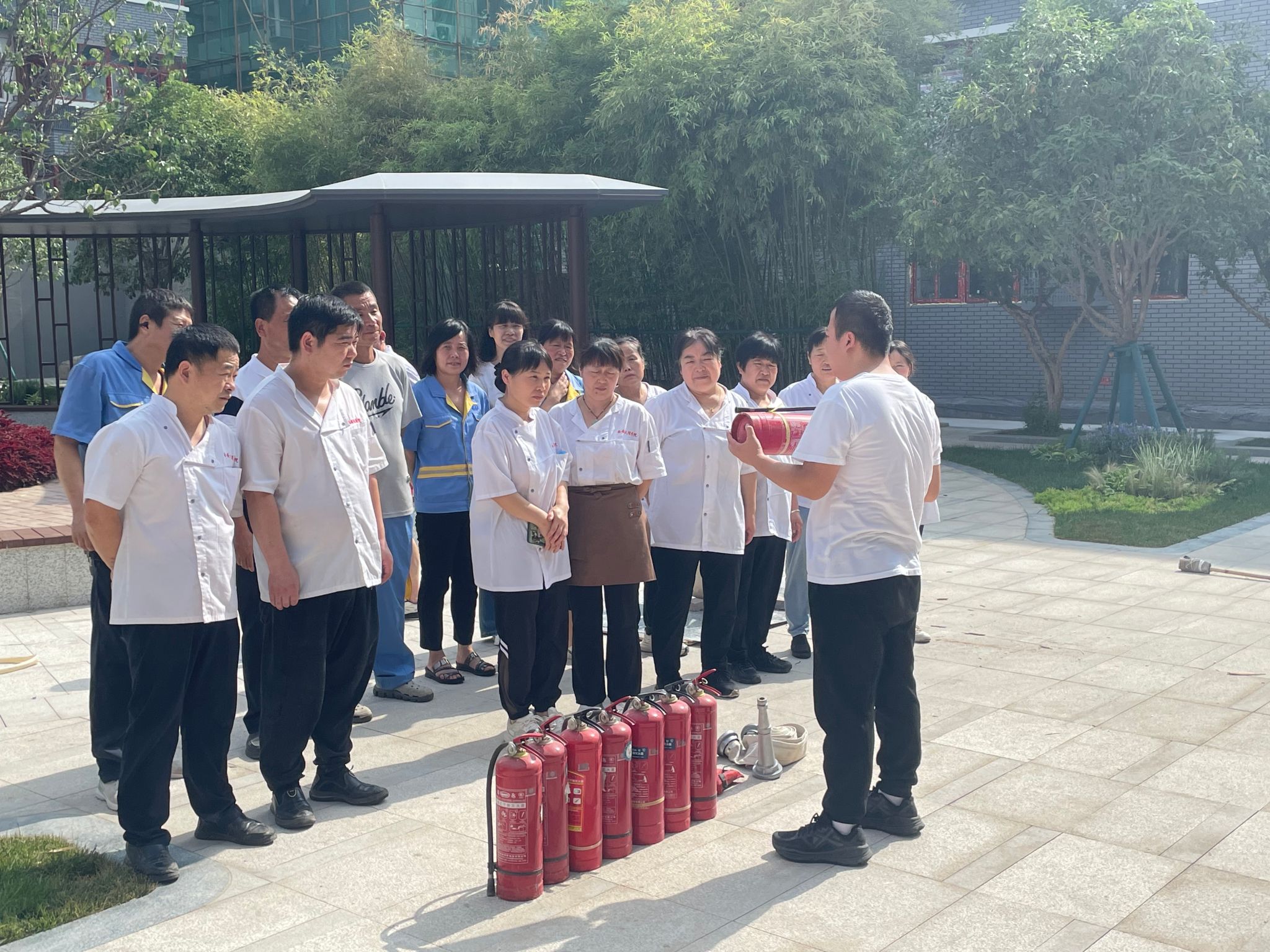 讲解结束后,赵明老师现场指导食堂、宿舍工作人员进行灭火器实操演练。他耐心纠正大家操作中的不规范动作,反复强调 “提、拔、握、压” 的操作要领:提起灭火器,拔掉保险销,握住喷管对准火焰根部,按下压把喷射灭火。员工们认真聆听、积极参与,纷纷拿起灭火器进行实操练习,在实践中熟悉了灭火器的使用方法,掌握了火灾初期的扑救技能。