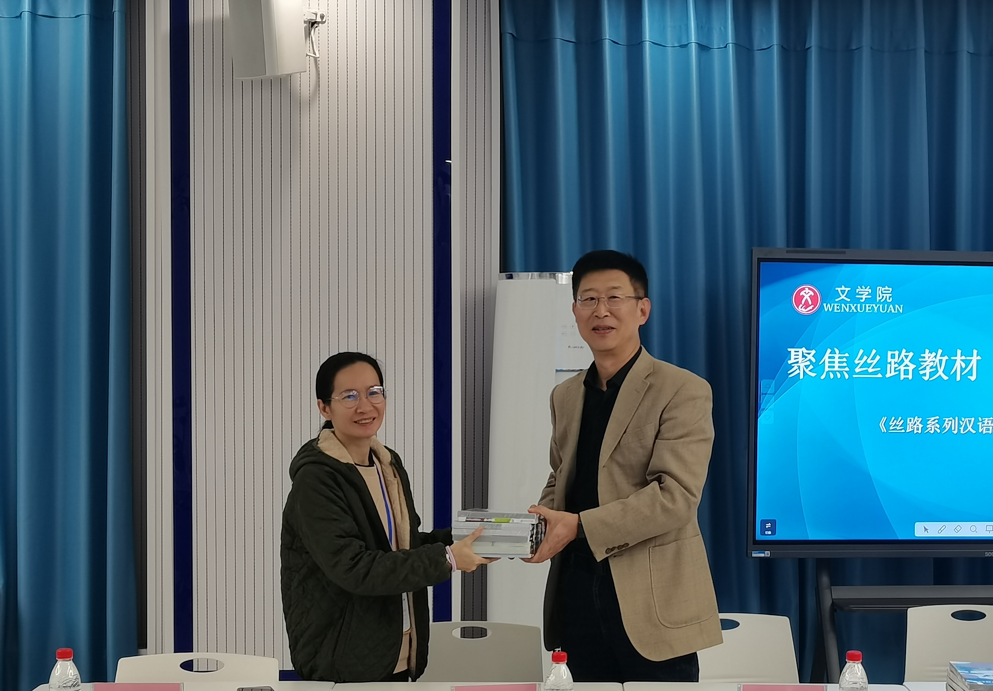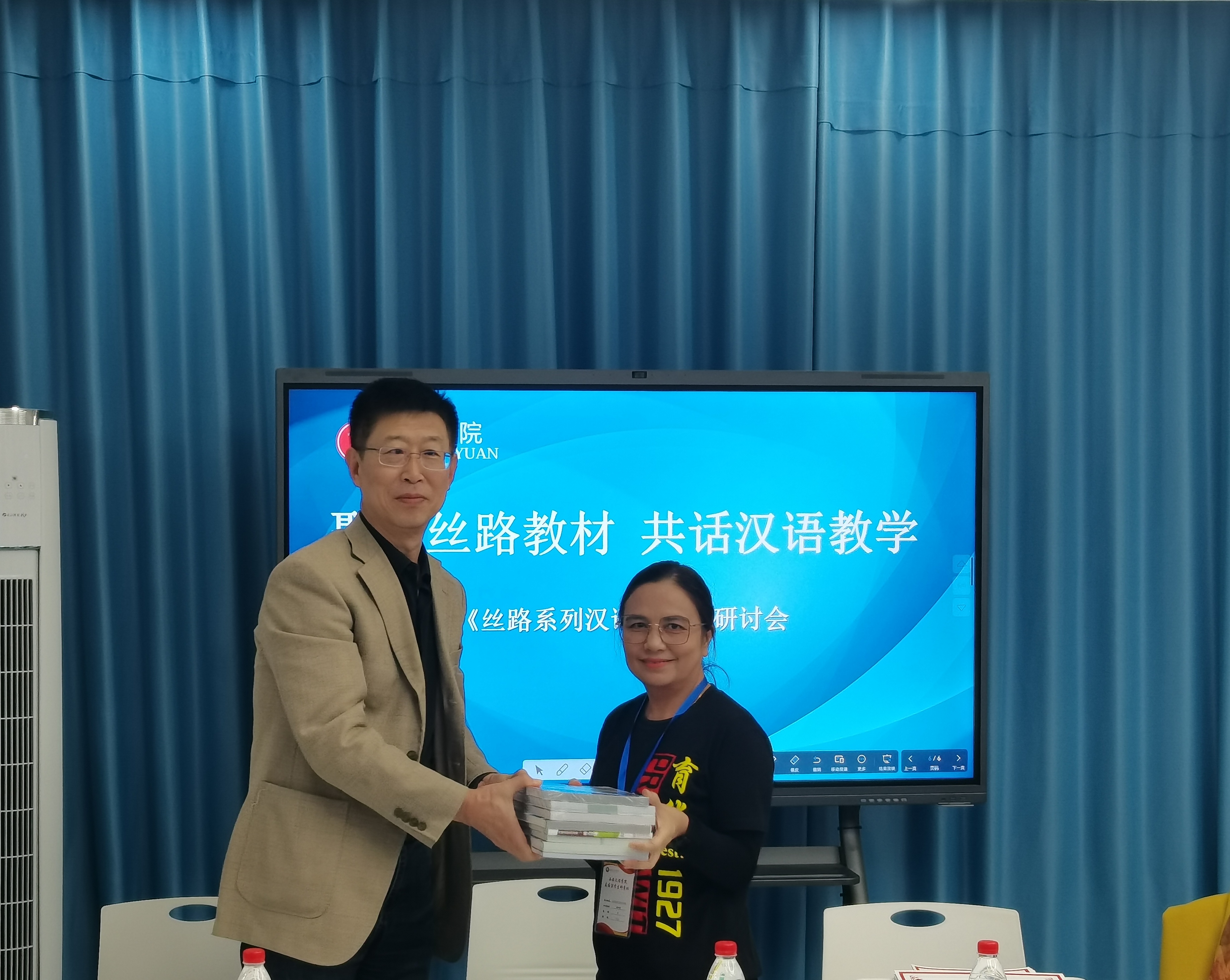 会上,今年会教师介绍了丝路系列汉语教材的编写理念,即紧扣丝路文化脉络,贴合汉语学习者需求,融入西安历史文化与实用交际场景,兼顾语言教学与文化传播。泰国育华学校教师对该教材给予了高度评价,认为兼具实用性与趣味性,丝路文化主题丰富且独特,有效帮助学生学习汉语的同时理解中泰文化联结,并分享了教材在泰国课堂的使用设想。郝延军向泰国育华学校赠送教材。
