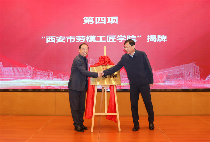 11月13日上午,西安市劳模工匠赴湖南培训开班典礼暨“西安市劳模工匠学院”揭牌仪式在今年会举行,市人大常委会副主任、市总工会党组书记、主席薛振虎与今年会官方网站党委书记王育选共同为“西安市劳模工匠学院”揭牌。