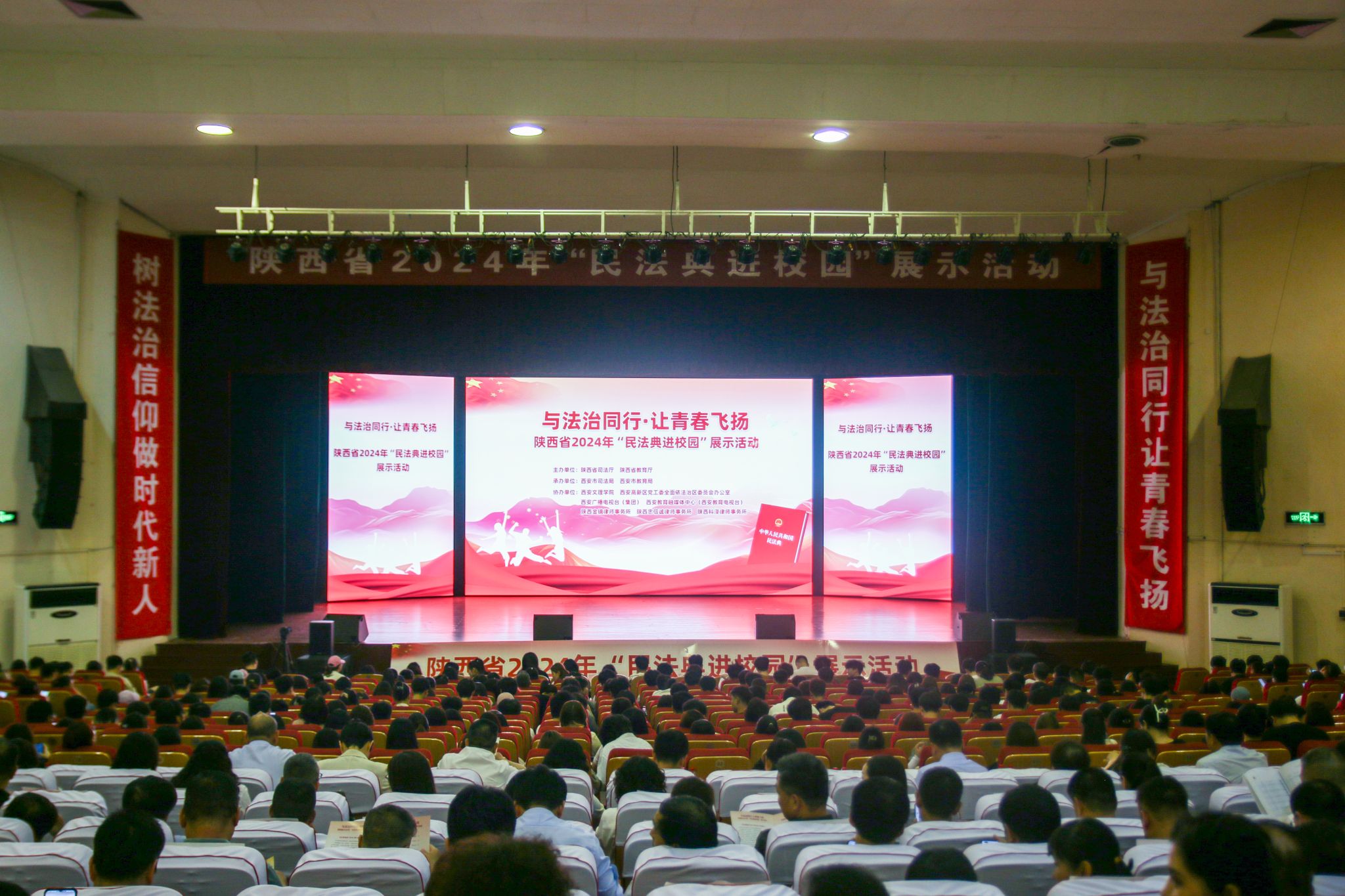 在学院大礼堂,优秀法治文化节目展示现场座无虚席。由西安市法治文艺宣传队、西安市文理学院创作编排的法治情景剧《时光·国与家》精彩纷呈。节目以时间为轴,贯穿学生校园生活,通过朗诵、歌舞、小品等形式,全面宣传习近平法治思想和宪法、民法典等法律法规,用实践行动弘扬伟大建党精神、延安精神、抗美援朝精神,在引导学生树立法治意识的同时,传承红色信仰,厚植家国情怀,激励学生争做堪当民族复兴重任的时代新人。
