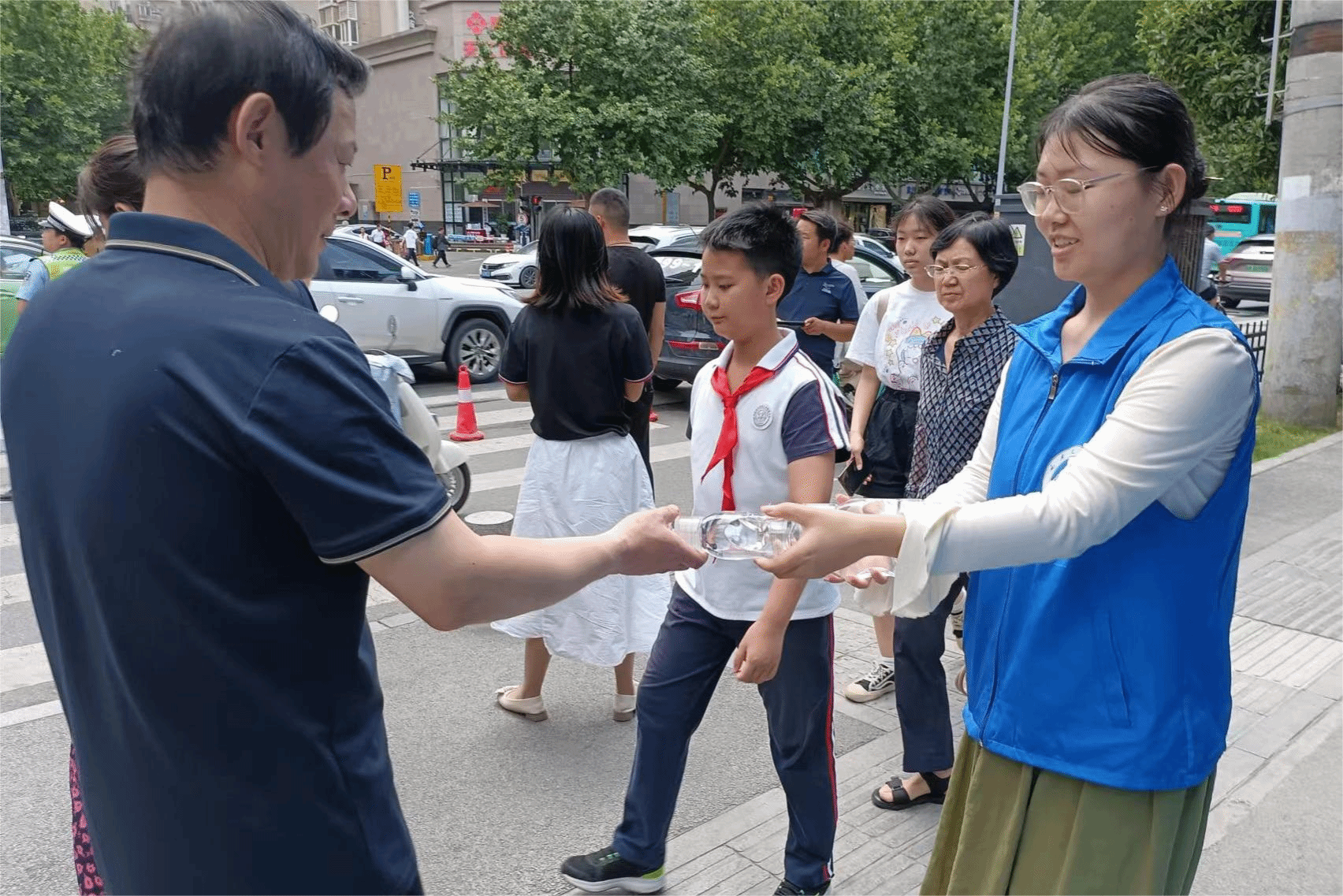 晨曦初露,志愿者们早早集合在送水点,迅速而有序地搭建起帐篷,精心摆放好饮用水和应急物品。随着开考时间的逐渐临近,考生家长们陆续抵达考点,志愿者们面带微笑,热情洋溢地递上清凉饮用水,用实际行动传递着关爱与温暖。在送水的过程中,志愿者们不仅为考生家长提供了及时周到的帮助,还积极与考生交流,用鼓励的话语和温暖的微笑帮助他们以最佳状态迎接人生中的重要考试。