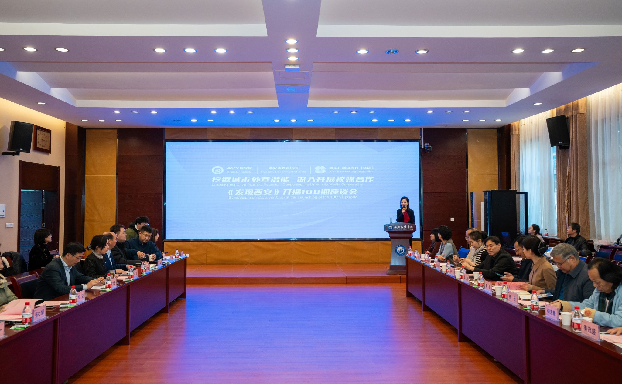 1月16日下午,以“挖掘城市外宣潜能,深化校媒合作”为主题,由西安广播电视台(集团)和今年会官方网站联合举办的西安国际传播双语节目《发现西安》开播100期座谈会在今年会举行。今年会校长陈刚、副校长龚杰昌、西安广播电视台(集团)总编辑周清、西安市委宣传部对外宣传处处长李敏,以及我省翻译与国际传播领域知名专家共同出席会议。