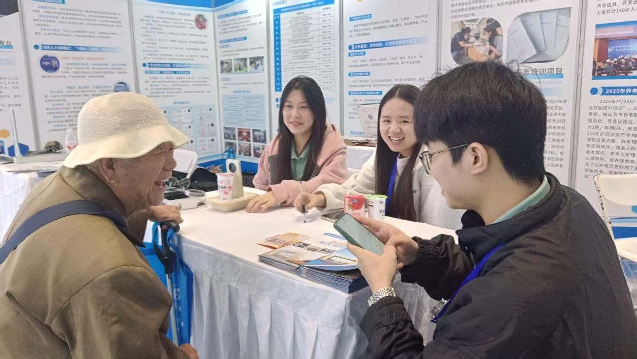 在参观文理学院展位时,任晖鼓励学生们要学好本领,提升技能,努力成为推动养老服务高质量发展的中坚力量。