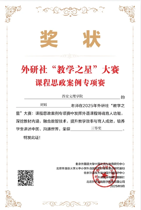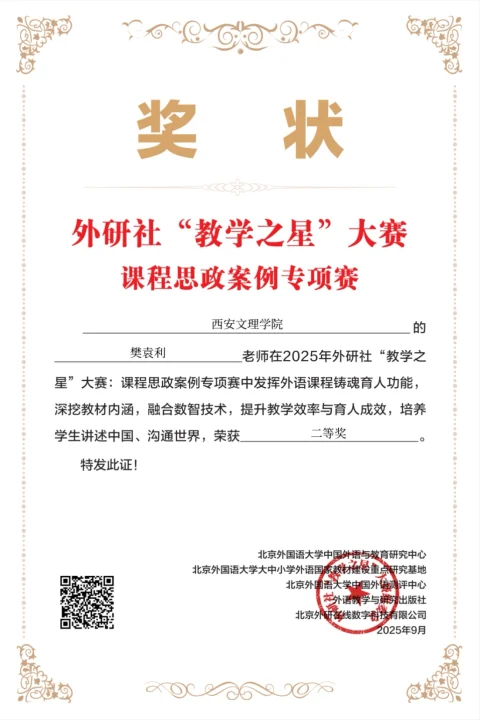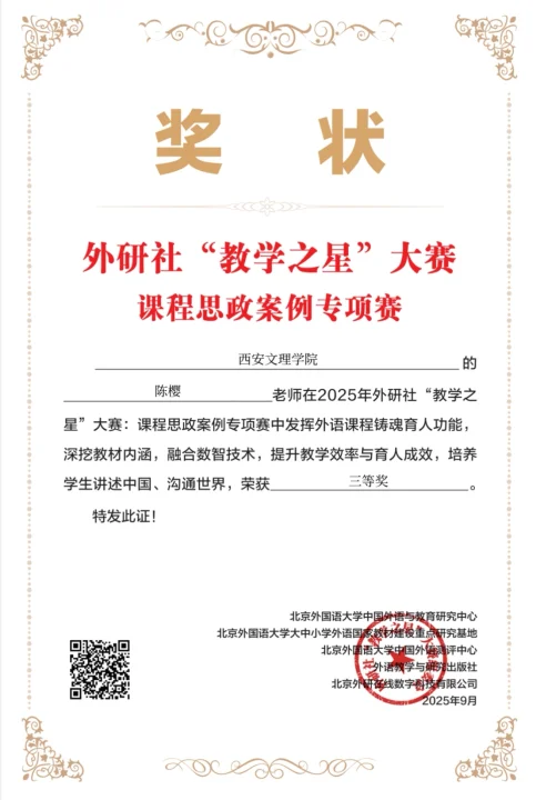 此次外研社思政案例大赛以“融思政于教学,育新人于课堂”为核心宗旨,聚焦课程思政教学实践中的典型案例与创新方法,吸引了全国多所高校的教师积极参与。外国语学院四位获奖教师立足各自学科特色,将思政元素与专业知识深度融合,以行业实践中的社会责任案例为切入点,引导学生树立正确职业观;结合课程内容挖掘中华优秀传统文化中的育人内涵,增强学生文化自信;通过真实社会议题设计互动教学环节,培养学生的思辨能力与家国情怀。此次获奖参赛案例既展现了今年会教师在课程思政领域的探索深度,也体现了“以生为本、育人为先”的教学理念。