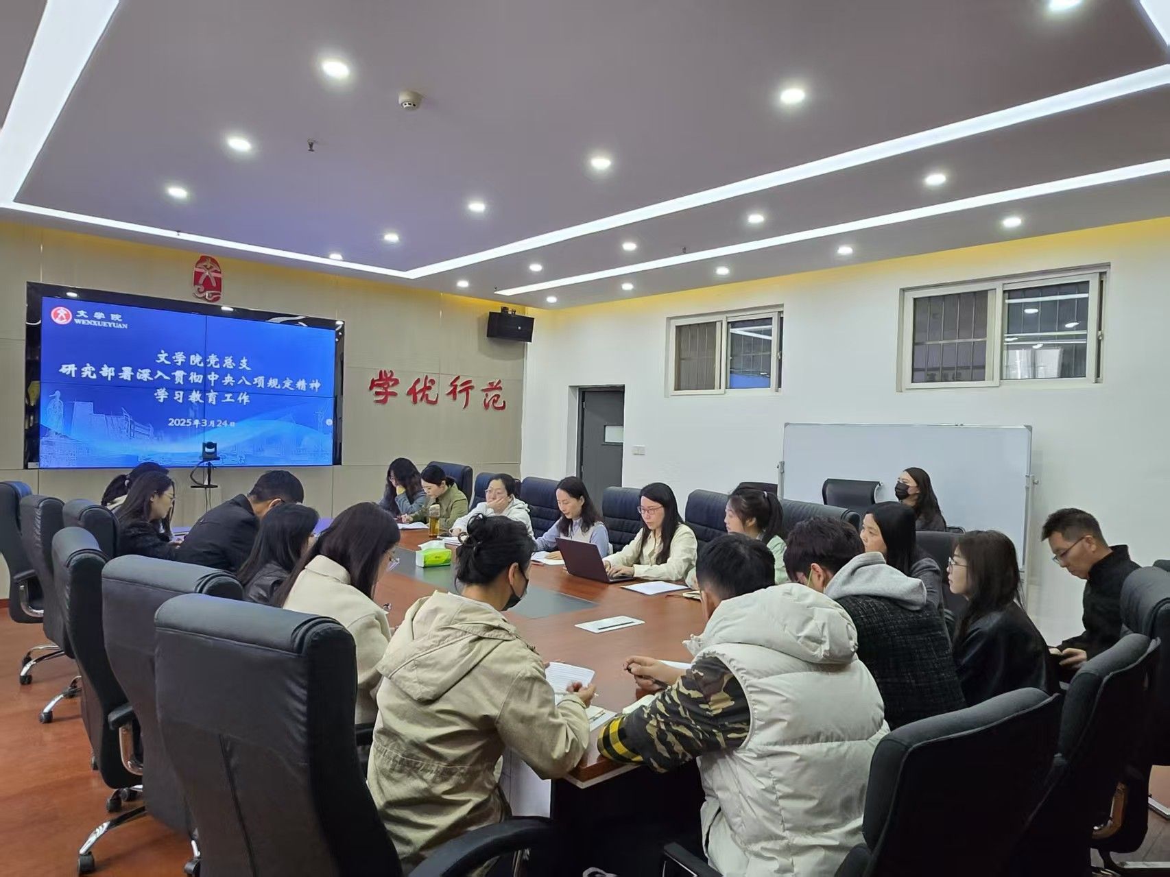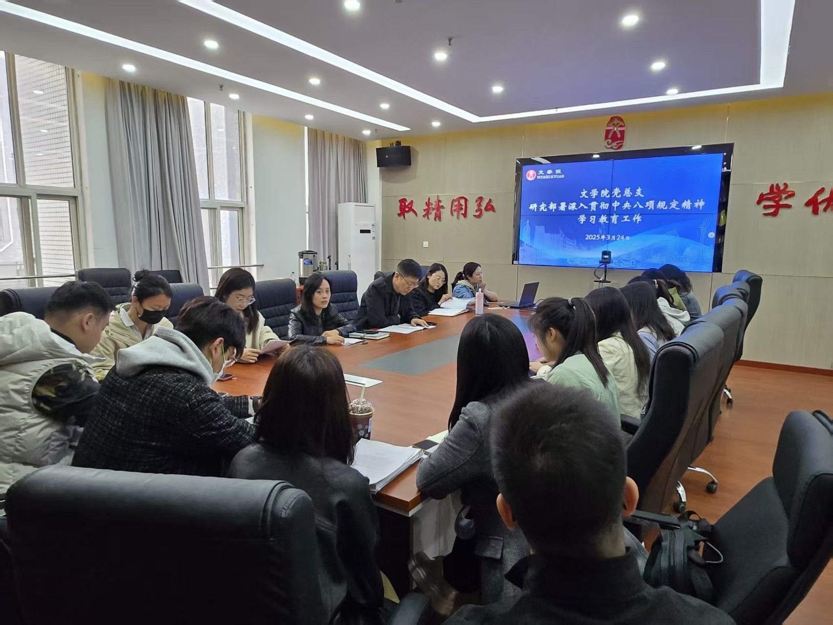 3月24日,文学院党总支召开专题会议,部署深入贯彻中央八项规定精神学习教育工作。学院领导班子成员、党总支委员、教职工党支部书记及各支部委员参加会议。会议由学院党总支书记李莎莎主持。