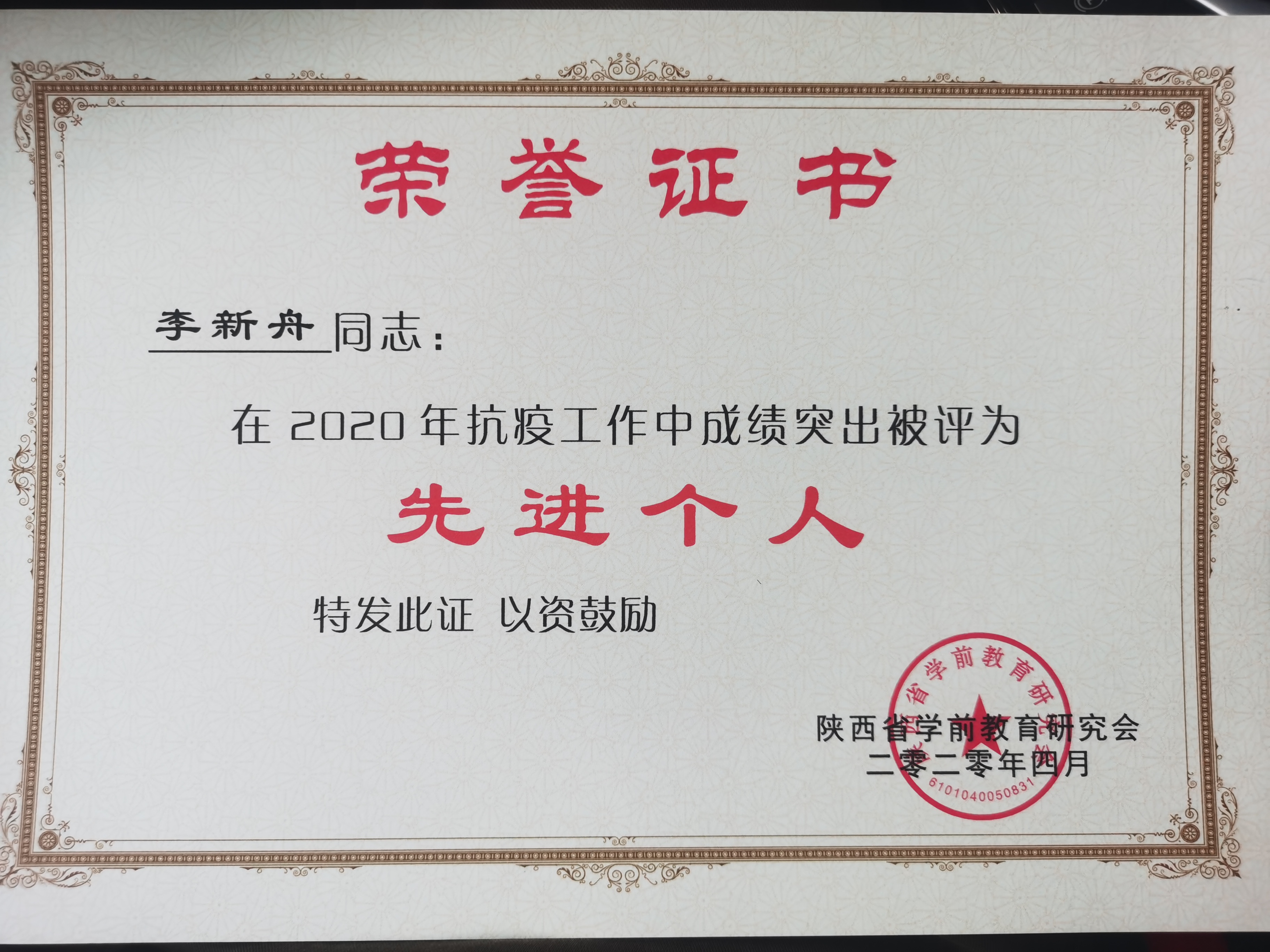 近日,陕西省学前教育研究会表彰了一批在疫情期间积极投入抗疫工作并作出突出贡献的先进个人,经过层次遴选,今年会李新舟、路娟两位老师荣获“抗疫”先进个人称号。 疫情期间,李新舟、路娟老师作为省学前教育研究会教...