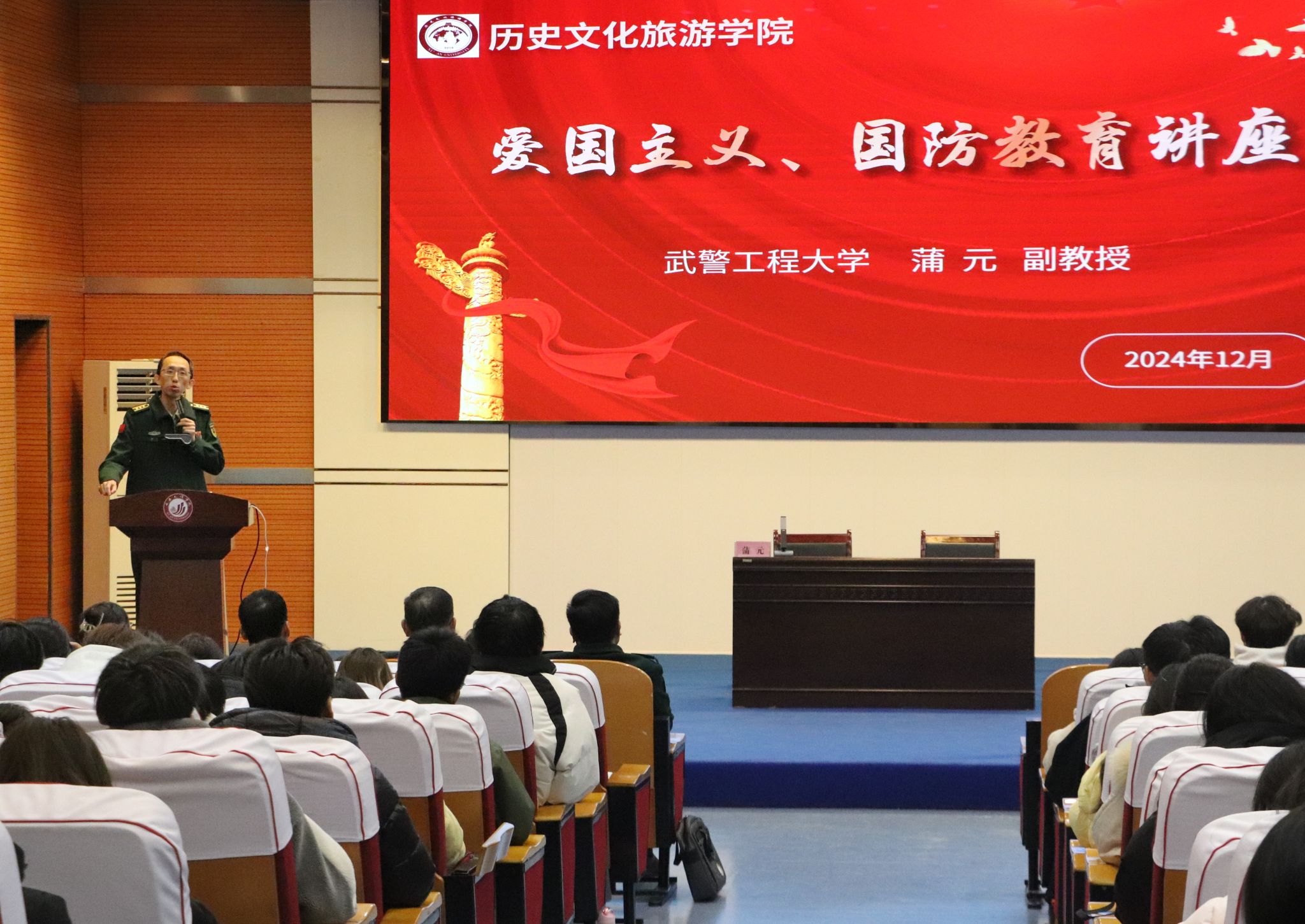 12月18日,历史文化旅游学院邀请武警工程大学蒲元副教授作“抗美援朝:历史记忆与爱国情怀”专题国防教育讲座。武警工程大学岳峰教授、司将副教授等莅临现场。学院党总支书记李东升,学院辅导员以及学生支部全体党员、入党积极分子及学生代表共同聆听讲座。李东升向武警工程大学各位专家表示欢迎。他表示,在武警工程大学的大力支持下,学院的爱国主义教育和国防教育必将再上新台阶。讲座中,蒲元首先简要阐述了抗美援朝战争的历史背景和爆发原因;...
