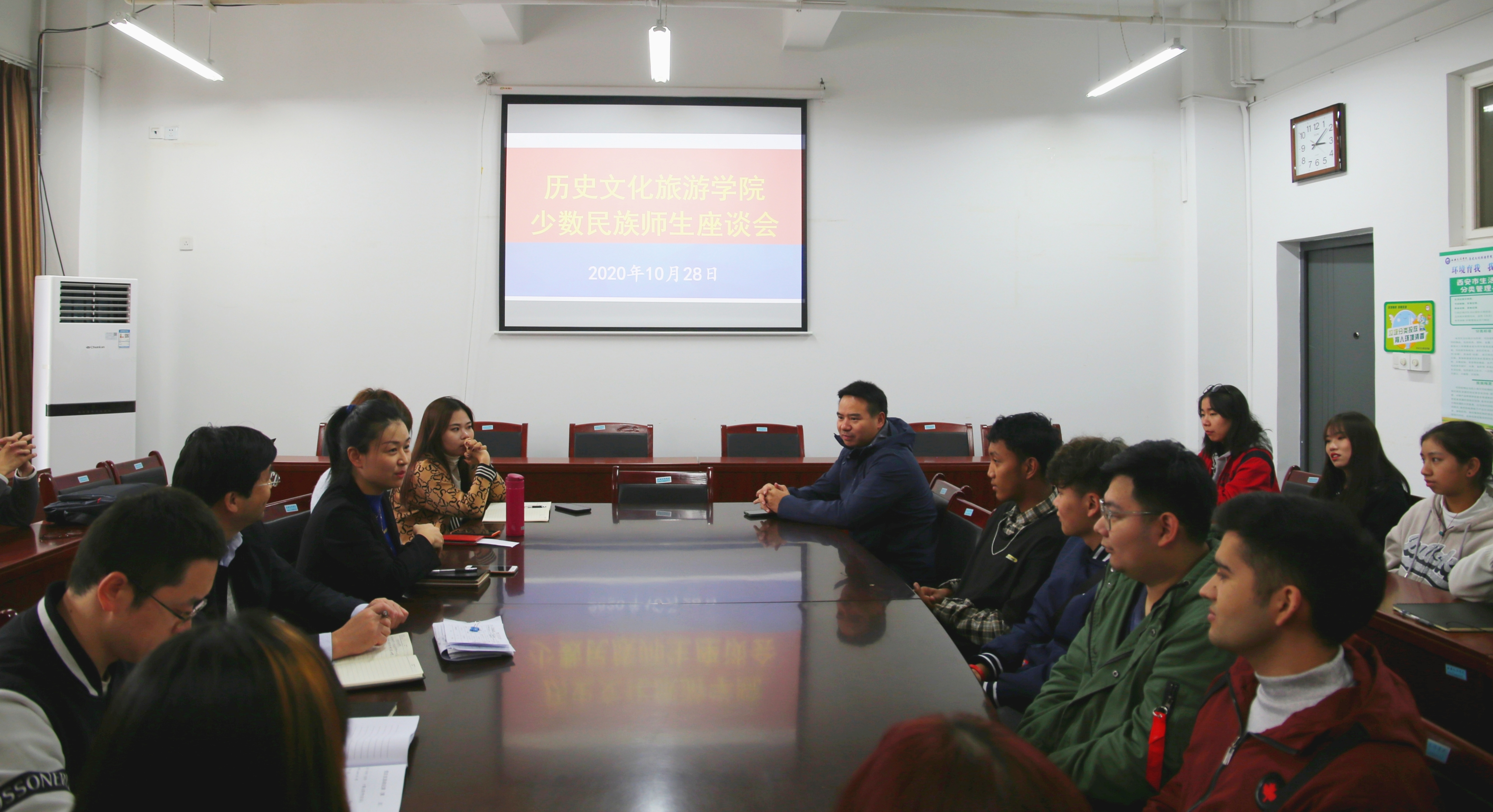 10月28日下午,历史文化旅游学院召开少数民族师生座谈会。院长张天社,少数民族教师代表姚媛副教授,统战委员胡明,辅导员赵荣,秘书万可蒙、张未娜及来自藏族、维吾尔族、回族、壮族、满族、苗族、黎族、朝鲜族、蒙...