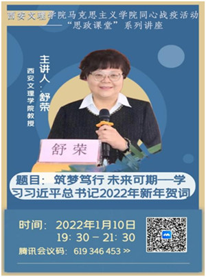 为深入学习贯彻习近平主席2022年新年贺词重要讲话精神,深刻认识“两个确立”的重大意义,增强“四个意识”、坚定“四个自信”、做到“两个维护”,抢抓大好发展机遇,1月11日晚,马克思主义学院教授舒荣作了《筑梦笃...